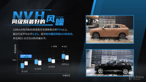 在NVH部分,汽油版车辆怠速状态下噪音低于36dB,在在发动机冷启动瞬间,可实现「立币不倒」;路噪表现方面,新车并没有单纯的进行堆料,毕竟还得考虑后期的成本,主要应用了柔性副车架结构,带来优异的减振效果和良好的路噪表现;风噪NVH部分,官方称120km/h车内前后排语音交流清晰度达到75%以上。