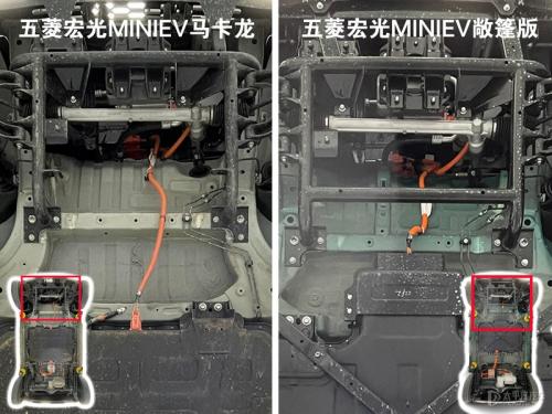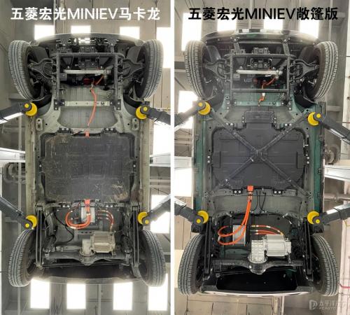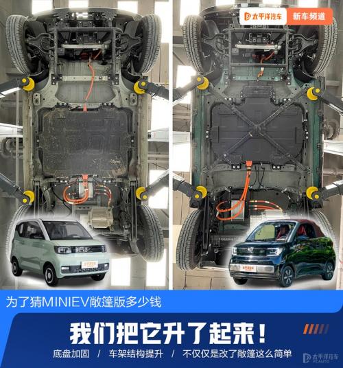 关于新车外观内饰,以及动态试驾,还有大家最关心的开关蓬的使用体验,早前我们的李喆李主编在参加车主活动是就已深度体验过,还没了解的小伙伴们可以尽情点击下方链接查看文章。而五菱宏光MINIEV敞篷版的新车视频,我们也有大动作,预计将在中秋前夕上线,大家也不妨关注下我们太平洋汽车网查看最新视频。值得一提的是,为了更直观地对比五菱宏光MINIEV敞篷版在底盘、车架方面有哪些提升,我们也借来了李主编的马卡龙版本,一起升起来看看敞篷版比普通版本做了哪些提升!不过比较遗憾的是,这次我们由于时间仓促,没找到GAMEBOY版来和敞篷版对比,毕竟新车是基于GAMEBOY版打造而来。不过毕竟马卡龙的价格是已知的,GAMEBOY版的价格同样已知,我们也可以大概来推测一下敞篷版的价格。