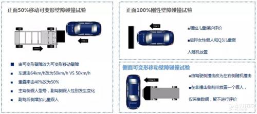 1、乘员保护部分包含碰撞试验、儿童保护静态评价和低速后碰撞颈部保护试验。其中传统汽车进行正面100%重叠刚性壁障碰撞、正面50%重叠移动渐进变形壁障碰撞和可变形移动壁障侧面碰撞三项试验。