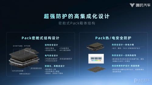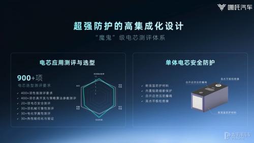 在电芯的验收部分,哪吒汽车会进行900余项的测评与选型,同时会对单体电芯内置短路的熔断保护、自开启的泄压防爆阀等安全防护。