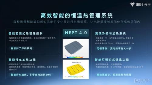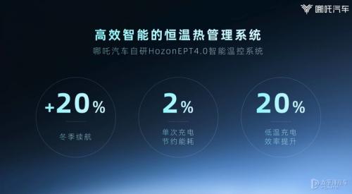 哪吒自研的HOZONEPT4.0恒温热管理系统包括前馈式热管理控制、智能行车加热、可预约式保温等功能,可增加20%的冬季续航、减少2%的充电能耗、提升20%的低温充电效率。
