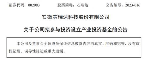 近日,芯瑞达发布公告,公司拟拟出资不超过1亿元参设安徽省芯车联动产业投资基金(暂定名,以工商部门最终核准名为准)。