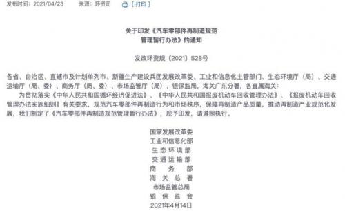 日前,我们从国家发改委获悉,为贯彻落实《中华人民共和国循环经济促进法》、《中华人民共和国报废机动车回收管理办法》、《报废机动车回收管理办法实施细则》有关要求,规范汽车零部件再制造行为和市场秩序,保障再制造产品质量,推动再制造产业规范化发展,国家发展改革委、工业和信息化部、生态环境部、交通运输部、商务部、海关总署、市场监管总局、银保监会共同制定了《汽车零部件再制造规范管理暂行办法》(以下称《暂行办法》)。