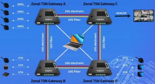 高速光纤TSN集中式架构以10G TSN Switch作为核心单元,扩展出10G Fiber、10G electronic、1G POF以及100/1000Base-T1等网络接口。TSN交换单元支持IEEE802.1 AS,IEEE802.1Qav,IEEE802.1Qbv的TSN协议,以及二层交换机相关标准协议。TSN交换单元还支持多路GMSL摄像头/以太网摄像头/激光雷达/4D毫米波雷达等传感器的接入,传感器采集的图像或点云数据通过以太网1722封包后由10G TSN Switch进行转发,传送至终端网关进行图像帧缓存、缩放、混合等处理,最终输出至显示接口。