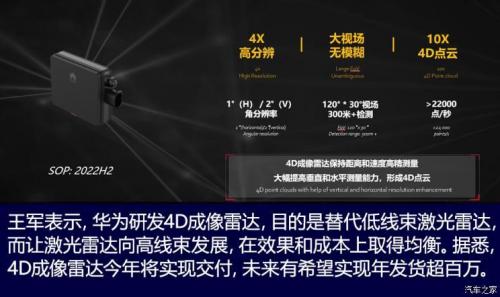 华为还带来了4D成像雷达。华为智能汽车解决方案BU融合传感雷达&摄像头产品部总经理苗立靖介绍,华为摄像头、毫米波雷达、激光雷达都在做,希望构建“铁三角”,三者相互配合实现更强大的自动驾驶。