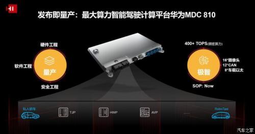智能驾驶计算平台MDC 810实现了发布即量产。华为智能汽车解决方案BU MDC产品部总经理李振亚介绍,MDC 810是业界目前最大算力的智能驾驶计算平台,稠密算力高达400TOPS,达到ASIL D功能安全要求。目前,华为MDC系列产品(MDC 210/MDC 300F/MDC 610/MDC 810)基于领先的基础平台与安全架构,提供48-400以上TOPS的弹性算力与丰富的传感器接口。