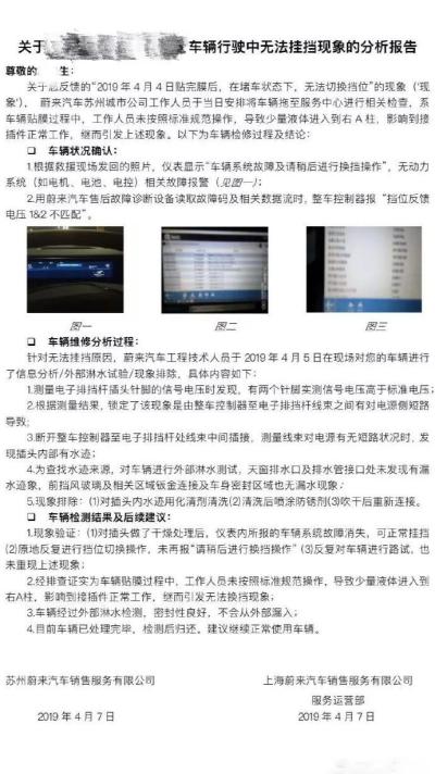 事后,蔚来官方给车主出了检测报告,称是贴膜时工人施工操作不当导致内部进水,因此车内挂挡机构失灵。此外,还对车外进行了淋水试验,并未发现车辆故障,因此车辆密封性良好,锅也就甩到了自家贴膜小工的身上。