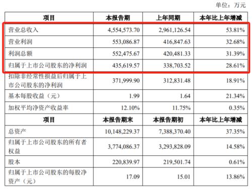 据宁德时代(300750)披露的2019年年度业绩快报,该年度宁德时代营业收入455.46亿元,同比增长53.81%,归属于上市公司股东的净利润为43.56亿元,同比增长28.61%。