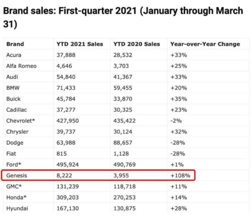 捷尼赛斯2021年第一季度在北美地区的销量来源:tflcar