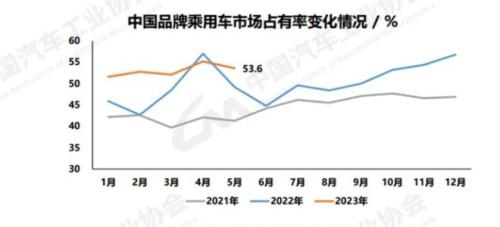 从整体来看,中国品牌的市场份额还是在提升,前5个月,中国品牌乘用车共销售478.1万辆,同比增长22.7%,市场份额达53.1%,占有率同比提升5.2%。不过从单月来看,5月,中国品牌乘用车销量109.9万辆,占乘用车销售总量的53.6%,占有率较4月减少1.6个百分点。