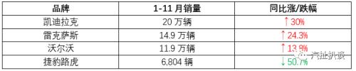 而就中国市场而言,沃尔沃11月共售出11,450辆新车,同比增长1.7%,同时1-11月累计销量达到118,725辆,同比上涨13.8%。虽然这个成绩相比凯迪拉克和雷克萨斯还有些差距,但对于一向“低调”的沃尔沃来说,也够令人感到惊喜。