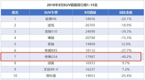 而广汽传祺9月销量为43,427辆,同比下滑5.97%。主力担当传祺GS4销量暴跌,在8月份一度超越博越位居第三,但到了9月份其销量仅为17987辆,腰斩40.2%,且跌到了销量排行榜第七位(排名来自乘联会数据),是前十排行,而整个前三季度暴跌31.5%,仅为18.15万辆。