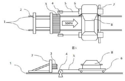 1-轨道、2-子弹车、3、碰撞壁障、4-刹车装置、5-制动拉索、6-滑动板、7-挡板、8-目标白车身