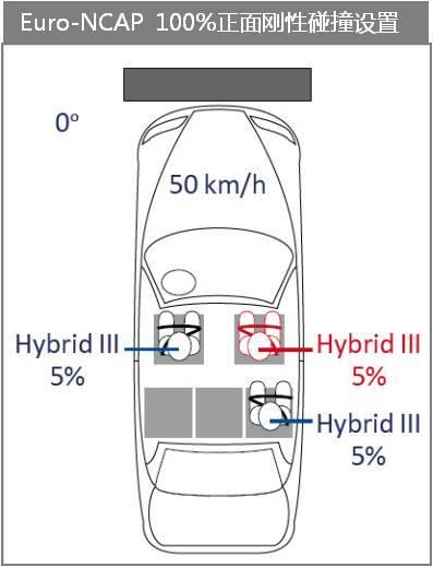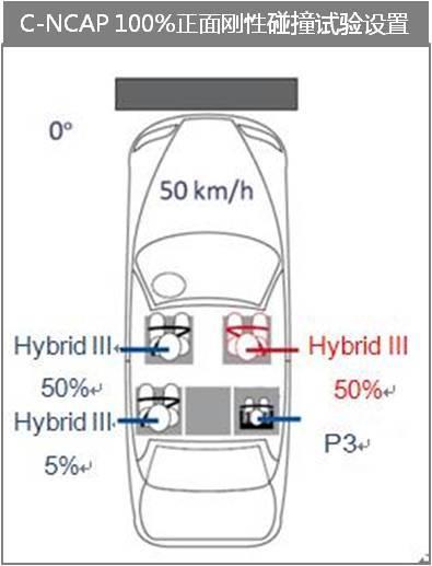 其中最为明显的一个差异是:在假人设置中,Euro-NCAP采用了三个5百分位的混Ⅲ女性假人进行试验,分别位于左前,右前及第二排右侧座位上,而C-NCAP则在前排座位采用了两个50百分位混Ⅲ男性假人,第二排左侧座位采用一个5百分位的混Ⅲ女性假人,第二排右侧座位采用一个P3儿童假人的方式进行试验。