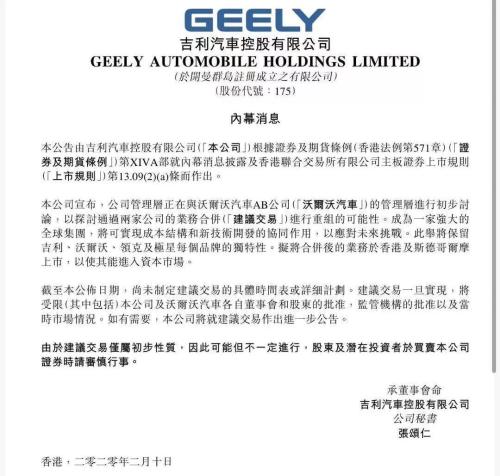 中国汽车新闻网讯2月10日晚,吉利汽车控股有限公司(HK0175)发布了一则名为“内幕消息”的惊人公告:吉利汽车管理层正在与沃尔沃汽车管理层就业务合并重组的事宜进行初步讨论,两家公司将会组成一家强大的全球公司。合并后的业务归于香港上市公司,在未来还会寻求在斯德哥尔摩进行上市。