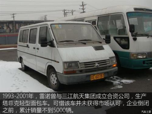 继神龙汽车之后,1993年12月31日,中国三江航天集团与雷诺汽车合资成立了三江雷汽车公司。三江雷诺主要生产8座、12座塔菲克轻型面包车,该车于1995年5月正式投放市场。可惜,塔菲克在国内始终没有打开市场,三江雷诺由于亏损严重,在2001年宣告破产。停产前,塔菲克总共仅生产了不足5000辆。