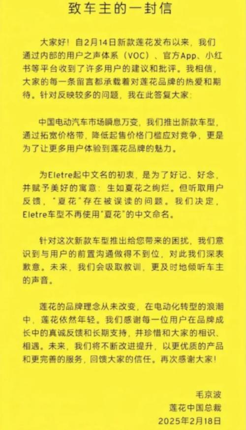 此番降价与新品发布,旨在打破品牌“小众”标签,扩大市场份额。然而,部分老车主对此表示担忧,认为此举降低了莲花品牌的定位,损害了他们的利益,呼吁恢复原有产品命名及价格体系。针对车主们的关切,毛京波于2月18日与数位车主面对面交流,并在随后的信中作出了上述回应。