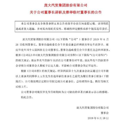 中国汽车新闻网讯6月20日,庞大集团发布《关于公司董事长辞职及推荐临时董事长的公告》,公告称公司董事会收到董事长、董事会战略委员会主任委员兼总经理庞庆华的辞呈,庞庆华因个人原因辞去公司董事长、董事会战略委员会主任委员及总经理职务。公司董事、副总经理王玉生在选举新任董事长之前代为履行董事长职务,公司将按照法定程序尽快完成公司董事长、总经理补选、聘任等相关后续工作。