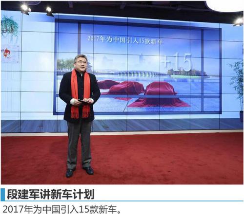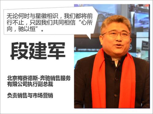 段建军说:“我们在2016年多个细分市场推出的重磅产品。‘加速改变’的C级车突破了10万辆销量大关;‘智者,大成’E级车持续受到客户好评;‘领袖座驾’S级车继续高歌猛进,保持王者地位,而且是在不以牺牲客户价值的基础上实现的。我们精密布局的SUV家族,再次不辱使命,创造了40%年增长的骄人业绩;还有年轻、时尚的新生代车型家族,也与那些思想前卫、心态年轻的客户们一拍即合。2017年,我们将继续推出15款精彩纷呈的新车,在每一个细分市场以更大的产品阵容,为客户带来惊喜连连。就像习近平主席前天在达沃斯论坛讲话中提到的:‘甘瓜抱苦蒂,美枣生荆棘’。展望2017,我们唯有心怀梦想,谨慎前行,才能百尺竿头,再进一步。”