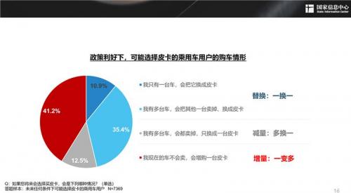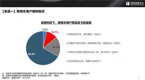 国家信息中心的部分调研数据也显示:“只要皮卡放开进城(其他政策不变),我就会买一台皮卡”的选择比例达10.7%;在有意向购买皮卡的乘用车用户中,选择“我现在的车不会卖,会增购一台皮卡”的比例为41.2%。