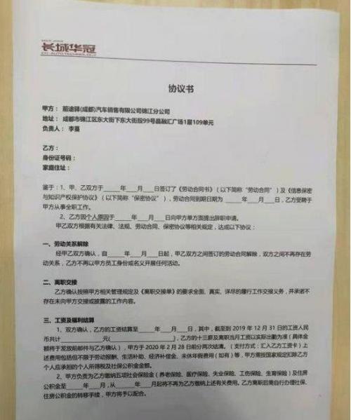 5、年后前途汽车再次使用离职协议的手段,忽悠200多名员工自动离职,约定在4月30日结算工资,但是公司的资金状况根本无力结清。离职协议给员工提供三个选择:①在本周内主动离职,公司确保在5月底结清工资,无赔偿。②选择在2日内协议离职,公司签署赔偿协议,按国家N+1标准提供赔偿金,在8月底结清工资。③选择在公司继续坚守,公司感谢员工的坚持,尽快为员工解决工资的发放问题,但是在短时间内无法给予时间的承诺。