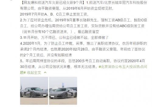 早在去年2月份,前途汽车就已经传出陷入困境的消息,母公司长城华冠也存在拖欠工资及供应商货款的情况。前途汽车当时表示,公司在资金方面确实存在问题,但是不影响员工薪资的发放。然而前途汽车的官微下,目前仍有疑似员工在评论中讨薪。