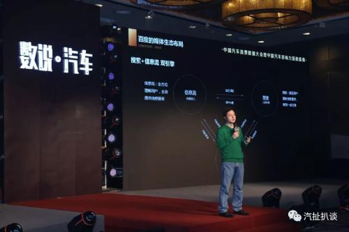 在现场,百度公司副总裁沈抖以“手机百度与汽车行业的融合”为主题进行了现场分享,从“内容信息分发与数据收集”、“搭建平台与信息整合”、“提供行业数据支持”三大角度阐述了大数据时代下如何做到海量数据与汽车行业进行有机结合。