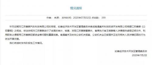 7月2日,江苏省如皋经济开发区管委会通报显示,江苏赛麟董事长王晓麟等人因涉嫌提供虚假证明文件、挪用巨额资产等问题,已被公安机关立案侦查。