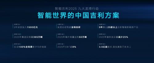 “5年研发投入1500亿元”、“5年内推25款以上全新智能新能产品”、“2025年实现L4级自动驾驶的商业化,完全掌握L5级自动驾驶技术”、“2025年集团总销量365万辆”……10月31日晚,吉利“九大龙湾行动”计划一经发布便轰动汽车圈。