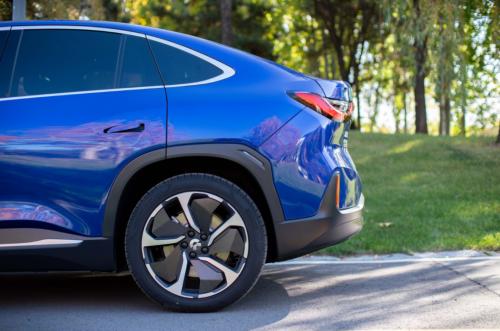 而车尾才是EC6最大的亮点,车身侧面车顶线条从B柱开始逐渐下降,形成了轿跑车的造型,整体相较于其他车型并不会显得臃肿。车尾设计很协调,特别是小鸭尾的设计,给车身尾部带来了层次感。甚至会有一种锁了车还会回望几眼的情形。外观的造型设计也让车辆的风阻系数能够获得0.26Cd的好成绩,ES6的风阻系数则为0.28Cd。