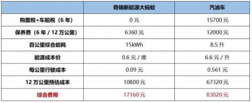 以目前市面上口碑不俗的纯电SUV奇瑞新能源大蚂蚁为例,6年开下来的养车成本只要17160元,相比汽油车竟然能省出65860元,相当于全家人去欧洲七日自由行的费用了!这么算算,还真是挺出乎意料的。