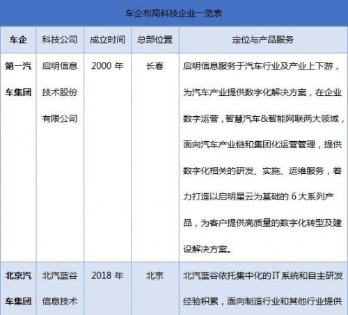 一方面是具备“科技公司”本质的造车新势力,组建了“百度+吉利”、“滴滴+比亚迪”、“阿里+上汽”、“360+哪吒汽车”等CP,为汽车行业带来了巨大的市场冲击。另一方面是传统车企的不断尝试,包括组建合资公司,在公司内部设立软件部门、下属IT公司等动作,以期助力企业加速数字化转型。【首席数字官】根据网络公开资料搜集整理了《车企布局科技企业一览表》,从布局时间、定位与产品服务等方面,可见各家均有差异。