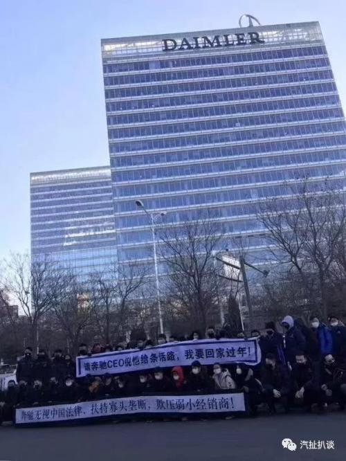 中国汽车新闻网讯还有不到半个月的时间就将迎来传统佳节春节了,处处都洋溢着过节的气氛。但在位于北京市望京路8号的奔驰中国总部戴姆勒大厦门前,却在近日聚集了几十名身穿奔驰商务车工作服的人员,拉着两条横幅,上书"请奔驰CEO倪恺给条活路,我要回家过年!""奔驰无视中国法律,扶持寡头垄断,欺压弱小经销商!"
