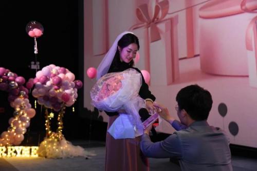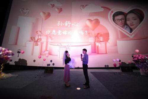 观影活动之后是互动抽奖环节,幸运嘉宾们均获得了‘爱妻大礼包’大礼,最后一位获奖的女嘉宾,更是被邀请上台领奖。而就在这时,女嘉宾身后的大屏幕中竟放起了她和男友甜蜜相恋的照片和视频花絮,伴随着浪漫气氛的烘托,一位手捧鲜花的男士走向台前,为女嘉宾送上了求婚戒指…原来,这是一场精心策划的求婚告白!