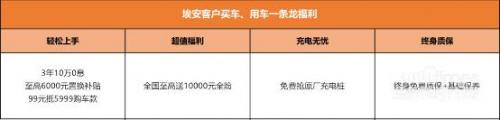 不过,3年10万0息目前只有买埃安的车才能享受才可享受,这点特别说明一下。虽然有了这个政策的加持,购车门槛变低了,但我们还要考虑用车成本,像车险投保、安装充电桩、日常保养等都需要考虑。同样,如果你买了埃安的车,上面的这些费用也基本可以忽略,因为埃安准备了送全险、送原厂充电桩、终身免费质保和基础保养等叠加福利,加上前面3年10万0息的金融政策,就是从买车到用车省心省钱的一条龙式服务。