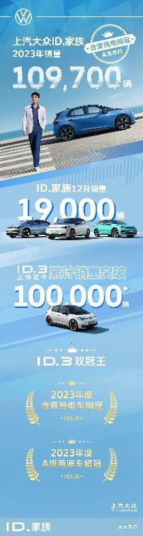 上汽大众ID.家族12月再创佳绩,单月销售突破1.9万辆。其中,大单品ID.3上市至今累计销量突破10万+辆,2023年位列合资纯电车销冠和A级两厢车销冠。