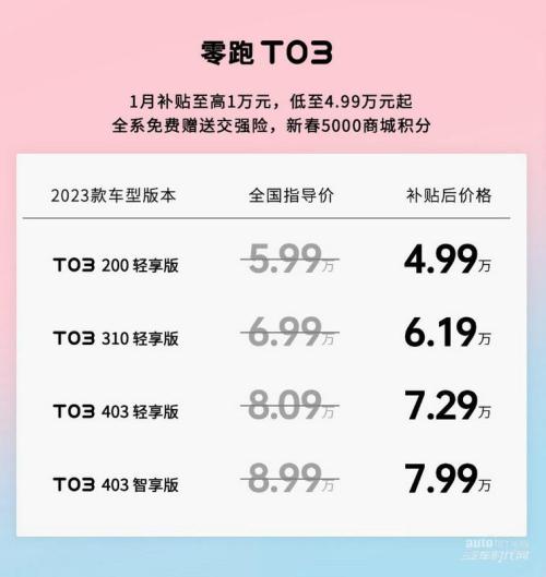 拥有新春大礼包加持,零跑T03 200轻享版低至4.99万元、310轻享版低至6.19万元、403轻享版低至7.29万元、403智享版低至7.99万元!只需4万元,五门大空间宝藏小车轻松开回家,零跑T03龙年陪你一起走街串巷!