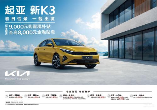 作为紧凑级轿车市场的品质家轿,起亚K3至今已获得超百万用户的青睐,换代后的起亚新K3在产品力方面全面进阶,为用户带来更高品质的出行体验。2月,新K3两款新增车型增配上市,在舒适性、智能化方面迎来大幅升级,具备始终可靠的品质、沉浸式舒享空间、同级领先的智驾系统,堪称合资紧凑型轿车的“质价比之王”。消费者购买起亚新K3即享9,000元购置税补贴、4,000元保险补贴、5,500元油费补贴、价值1,200元增值权益礼包(1年“出行无忧”太平洋保险+500元续保基金)、至高8,000元金融贴息、2,500元/台置换津贴(非置换1,000元/台津贴)以及5年5次免费保养等七重好礼。
