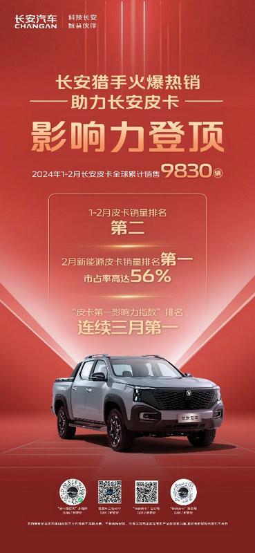 2024年1-2月,长安皮卡全球销量近万辆,皮卡销量排名第二,新能源皮卡销量更是强势登顶。特别是全球超级增程皮卡长安猎手的亮相以来,长安皮卡已经连续三个月,“皮卡第一影响力指数”排名第一。随着长安猎手的正式上市,增程皮卡也正在颠覆着全球皮卡市场格局。
