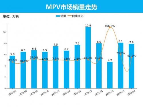 那么还有一个问题就是,除了7座SUV市场会更受欢迎,国内MPV市场是否会迎来一个高峰,引得车企争相布局呢?数据显示,2021年1-4月,MPV累计销量28.6万辆,同比累计上涨58%。较去年累计情况相比,MPV累计销量增幅上涨97%,有不断上扬的态势。不过崔东树预测MPV受三孩政策影响下的增幅依然有限,因为目前国内MPV的主要用途仍是商用,家用MPV的占比较小。