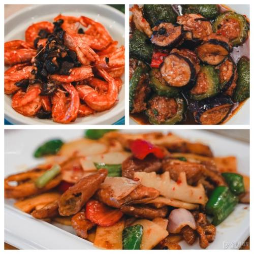 晚餐在酒店餐厅简单解决,都说广东人不吃辣,但韶关这边属于广东和湖南的交界,当地的饮食口味其实已经接近湖南了,上的菜基本都是默认微辣的,我们点了爆炒大肠、油焖大虾、和红烧茄子,味道还不错。不过我们也没吃太饱,因为今晚的行程还安排了逛夜市和打卡韶关小吃。