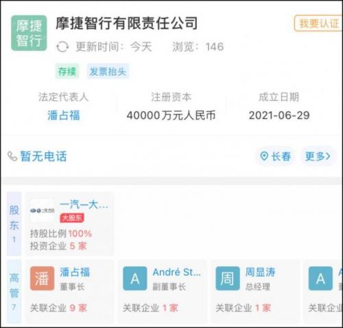 汽车之家从企查查处获悉,6月29日,摩捷智行有限责任公司(简称摩捷智行)正式成立,注册资本4亿元人民币,由一汽-大众汽车有限公司100%控股。