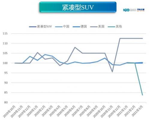 3月,紧凑型SUV市场价格指数为100.17,同比-3.17%,环比+0.08%;德系、美系持平,中国(+0.31%)微涨,其他车型(-16%)跌幅较深。均价整体16.56万元;中国车系16.47万元,德系27.29万元,美系19.28万元,其他车系29.90万元。