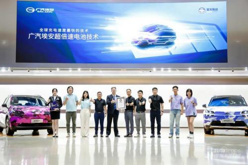 此前,来自SPEED++车队,搭载了广汽埃安超倍速电池技术的AION神秘挑战车在8月30日举行的“全球最快充电速度世界记录挑战”全网直播活动中,成功实现“充电5分钟,行驶207公里”的成绩,并获得了世界纪录认证机构(WRCA)的权威认证。