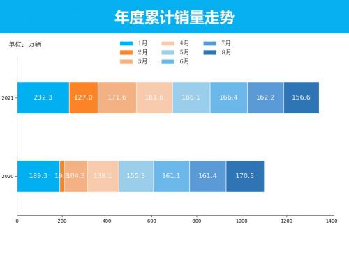 从累计销量数据来看,2021年1-8月,乘用车累计销量1343.8万辆,同比累计上涨22%。较去年累计情况相比,乘用车累计销量增幅上涨40%。