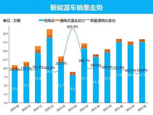 从能源类型角度来看,8月新能源车销量为18.3万辆,环比上涨3%,同比上涨109.8%,与7月相比,同比增幅上涨2.7%。其中,纯电动车销量为17.5万辆,环比增长4.2%,同比增长127.1%,纯电动车仍占据着新能源车的主要市场份额;插电式混和动力车型的销量为8623辆,环比下降12.9%,同比下降17.2%。