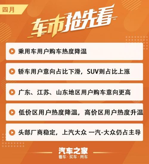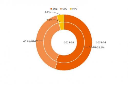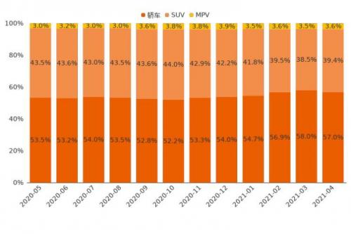 4月,轿车、SUV、MPV用户购车意向占比分别为57.0%、39.4%、3.6%。轿车用户意向占比相较上月下降1.0%。SUV用户意向占比开始转跌为升,环比增加0.9%。MPV用户意向占比相较上月上升0.1%。