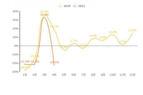 首先,我们来看一下用户整体购车热度的走势如何。2021年4月,乘用车用户意向数量环比下降22.1%。4月乘用车购车热度降温。