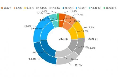 通过分析近12个月的用户意向数据发现,2020年05月至今年4月,12万以下价区用户意向占比增加1.6%,随着人们收入水平提高,低价市场热度有所升温;12-20万价区用户意向占比下滑3.3%,市场热度有所下滑;20万以上价区意向占比,上涨1.5%,其中,20-30万市场热度保持一定增长,近12个月用户意向占比上涨1.3%。