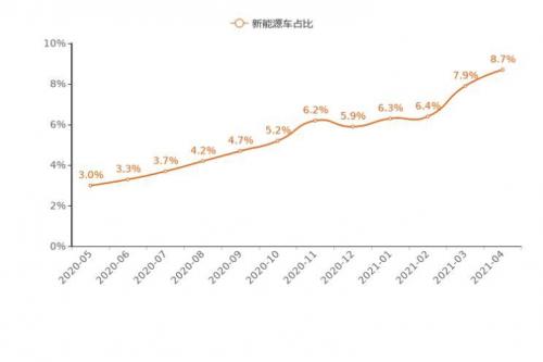 今年4月,乘用车中新能源车用户购车意向占比为8.7%,相较上月小幅上涨0.8%。新能源车近一年来迎来持续性增长,在乘用车市场新能源意向占比呈上扬态势,不断增长。